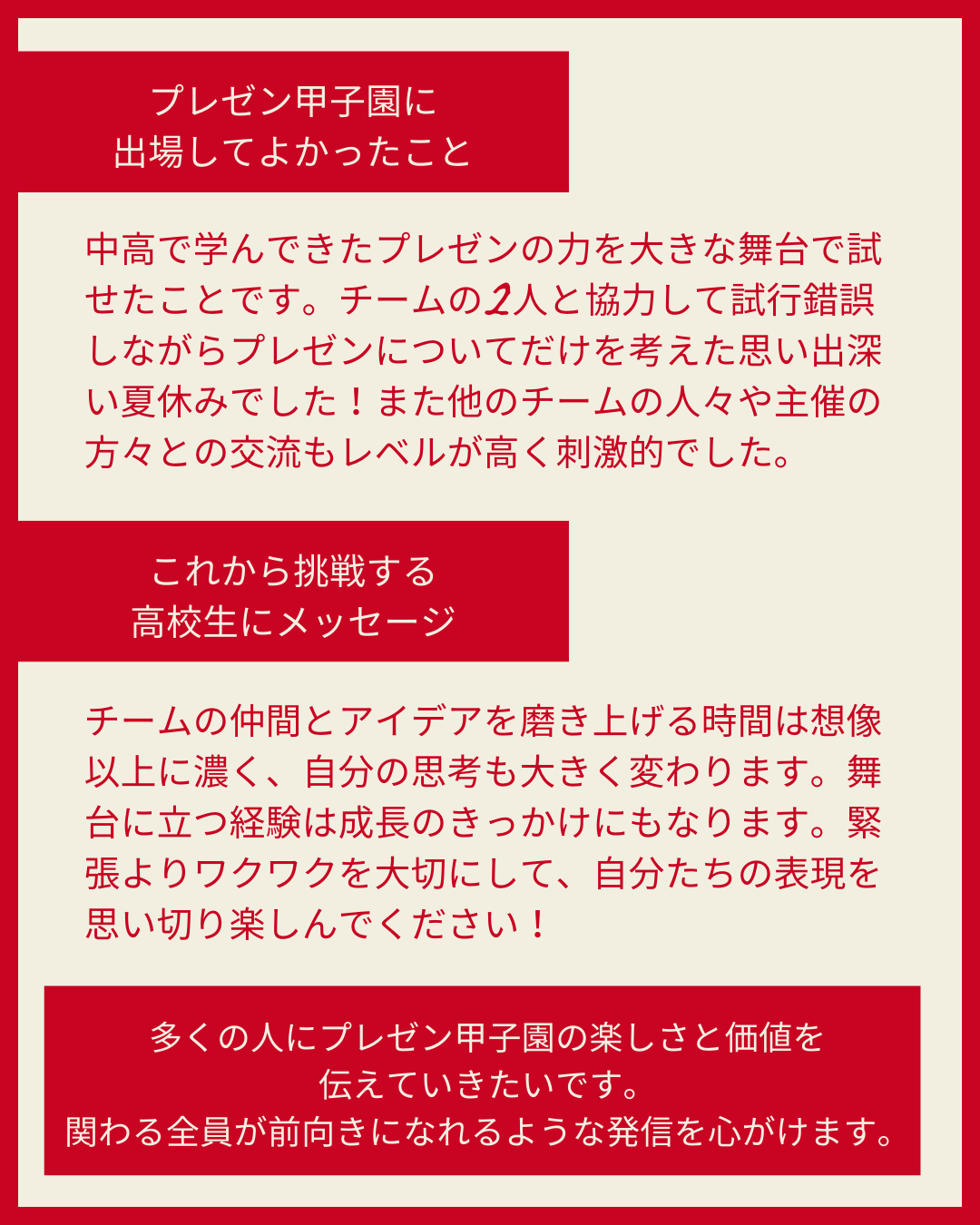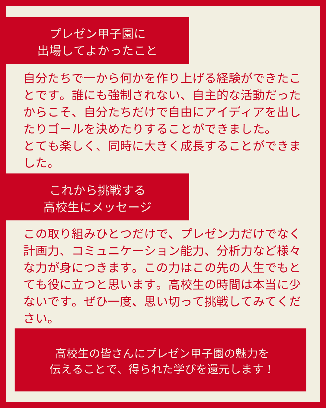 プレゼン甲子園をより盛り上げ、プレゼン甲子園に挑戦したいという高校生をサポートするために歴代の決勝大会経験者から有志にて結成されました。