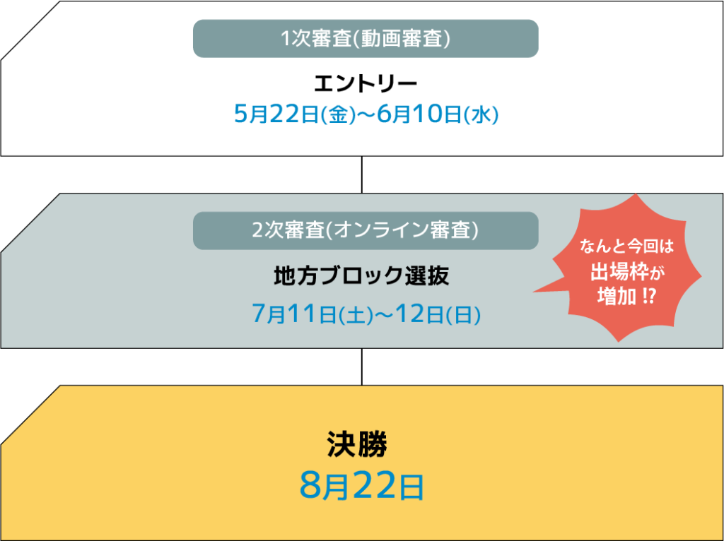 今年はそれに加えて、2次ブロック大会の進出枠が地域ブロックの申し込み数が100チームを越えるごとに1つ追加されます。より沢山のチームに審査員に直接念いを伝えてほしい。その念いを形にしました。