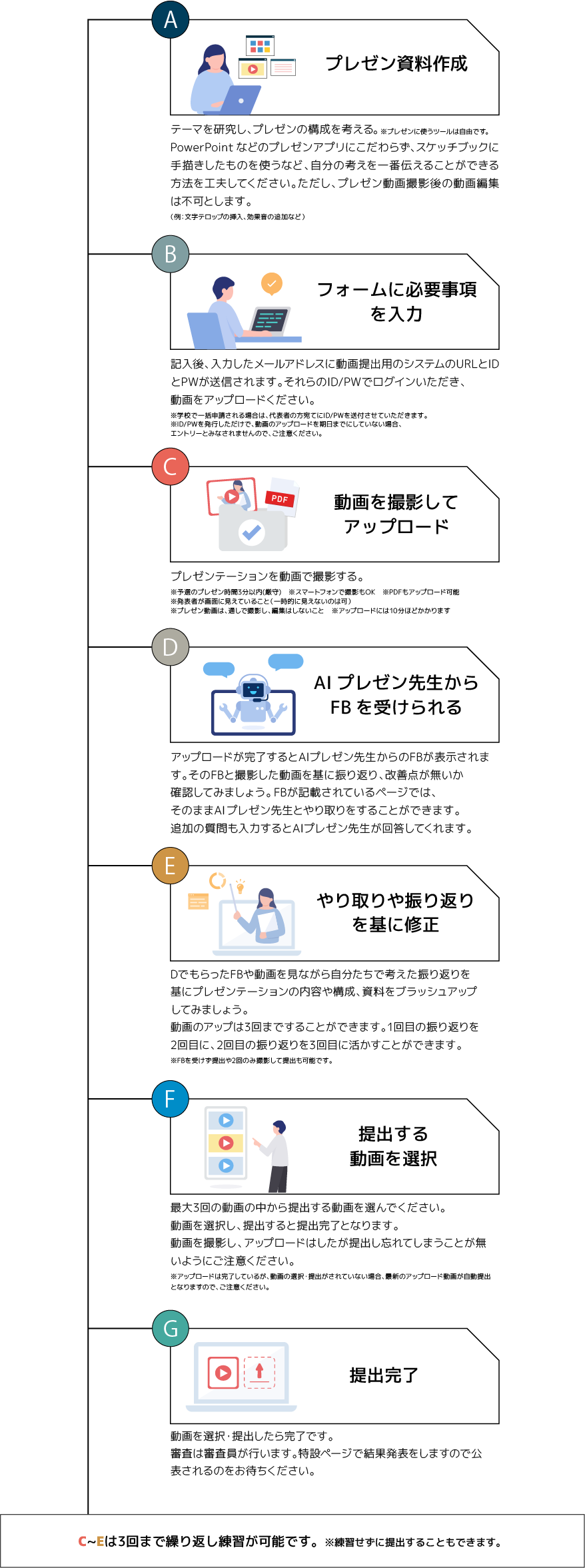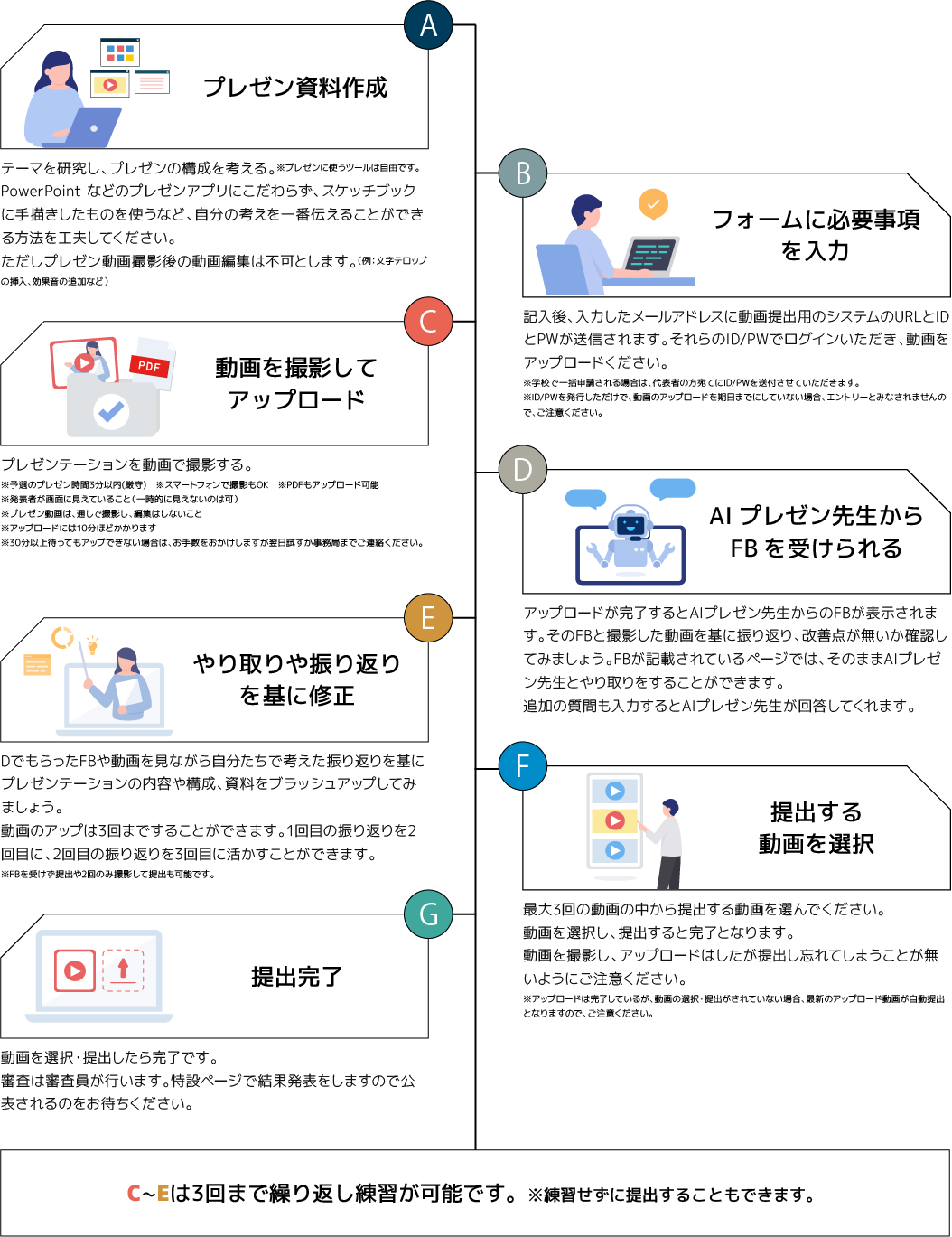 今年もAIプレゼン先生があなたのパートナー(伴走者)としてより良いプレゼンテーションにするお手伝いをしてくれます。撮影した動画をアップロードすると、AIプレゼン先生が動画にFB(フィードバック)をしてくれます。さらに、今年は動画に加え、スライド資料もアップロードできるようにしています。AIプレゼン先生がスライドに対してもFBをくれます。